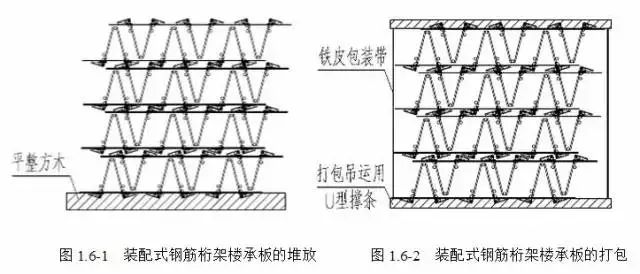 1、鋼筋桁架樓承板應遵循相同規(guī)格同垛堆放的原則。堆放時兩塊板正反倒扣為一組,堆放在平整方木上,如圖1.6-1所示。